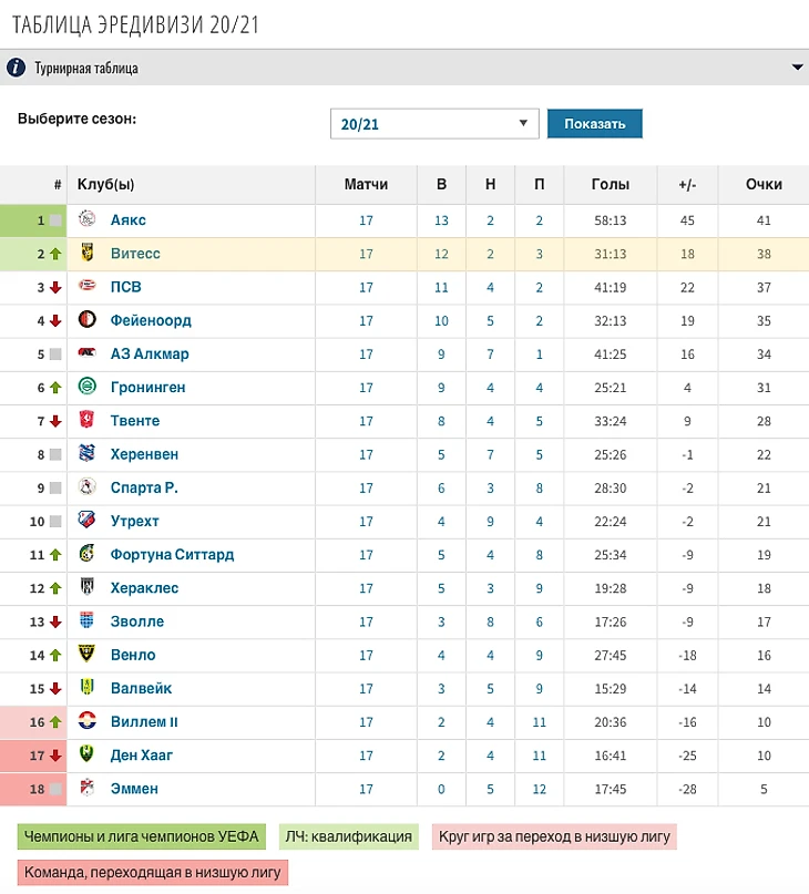 Таблица Эредивизи после 17 тура