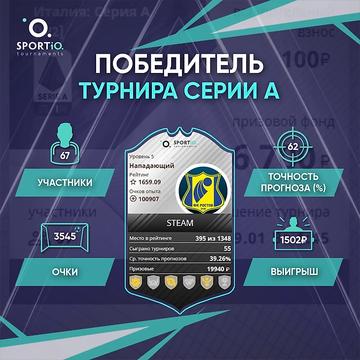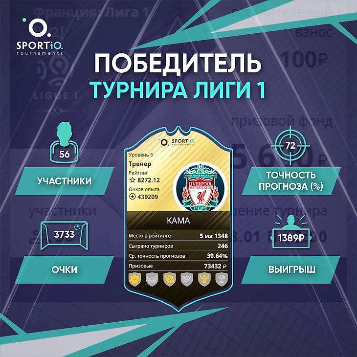 KAMA лучше всех выступил в Турнире Лиги 1 он заработал 1389₽ прозовых.