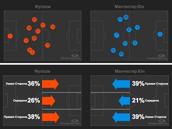 Фулхэм сыграл в 5 защитников, чем затруднил жизнь нашим крайним нападающим: Марсьялю и Гринвуду. Обычно чаще атакующий левым флангом Юнайтед в этот вечер использовал оба одинаково.