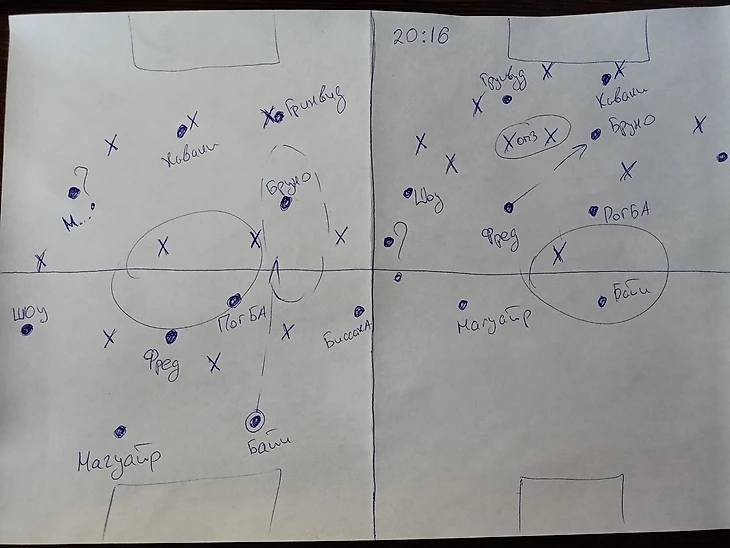 Во-вторых, уже из диспозиции команд исходил очевидный вариант для Юнайтед обострять игру. Чтобы это понять я нарисовал все на бумаге, потому глядите ниже какой вигвам.