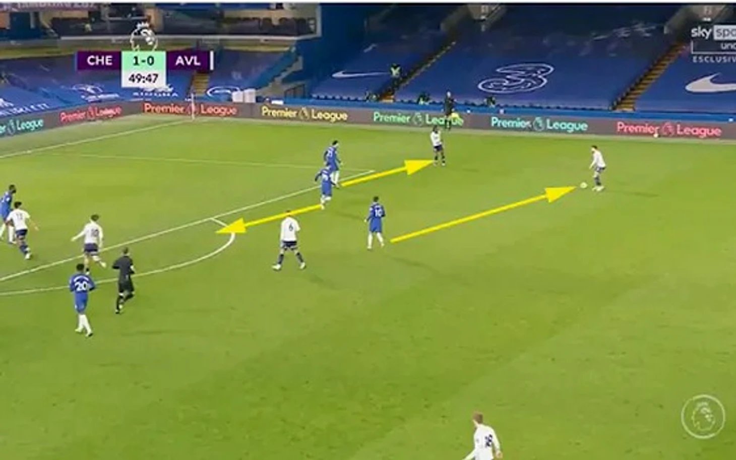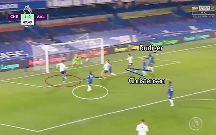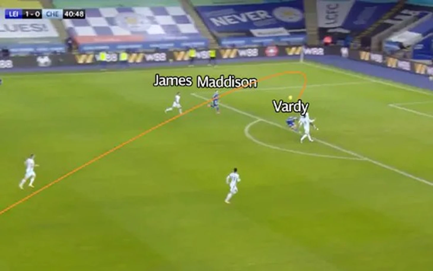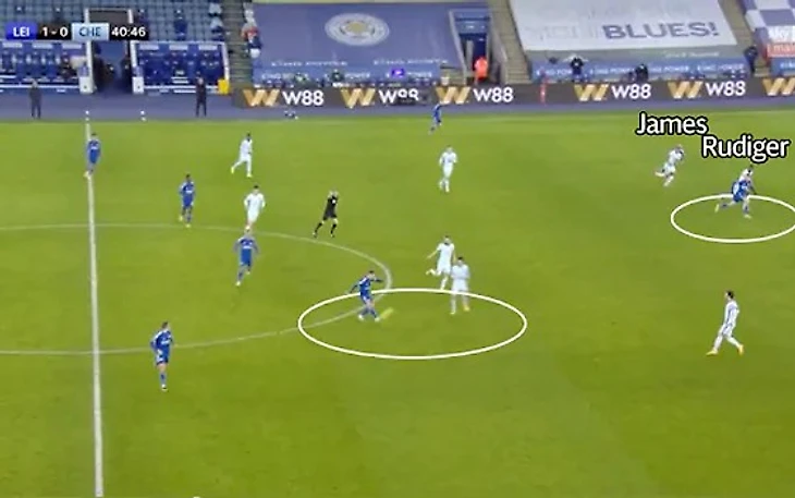 …и на него выполняется заброс. Тем временем, Рис Джеймс довольно неспешно возвращается в оборону, видимо, будучи уверенным в том, что Рюдигер выиграет верховую борьбу. Однако этого не происходит: Варди падает в борьбе с Рюдигером, но мяч отскакивает к Мэддисону. Таким образом, недостаток самоотдачи или непонимание остроты ситуации (а может, и то, и другое) со стороны Риса Джеймса дают Мэддисону возможность оказаться 1v1 с голкипером и хладнокровно уложить мяч в угол ворот. В этой ситуации свою роль сыграли сразу несколько факторов: Пулишичу нужно было более решительно вступать в борьбу в центре, а затем приложить усилия для того, чтобы не позволить Олбрайтону сделать передачу; Джеймсу необходимо было двигаться быстрее, держа в голове наиболее опасный вариант развития событий, а не надеяться на партнёра; Рюдигер, в свою очередь, мог более эффективно сыграть в воздухе. «Многие наши футболисты сегодня плохо двигались и не закрывали пространство, а это базовые и очень важные действия в игре без мяча. При владении мы смотрелись неплохо, хотя и тоже недостаточно мобильно. Словом, мы не сумели найти свою игру», - сказал после этого матча Лэмпард. Похожие ошибки имели место ещё в нескольких ситуациях. Например, в матче с «Астон Виллой» (1:1).