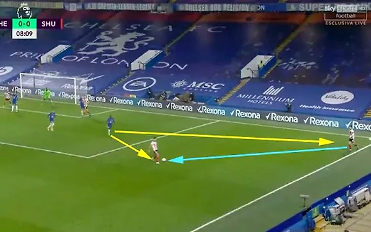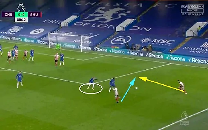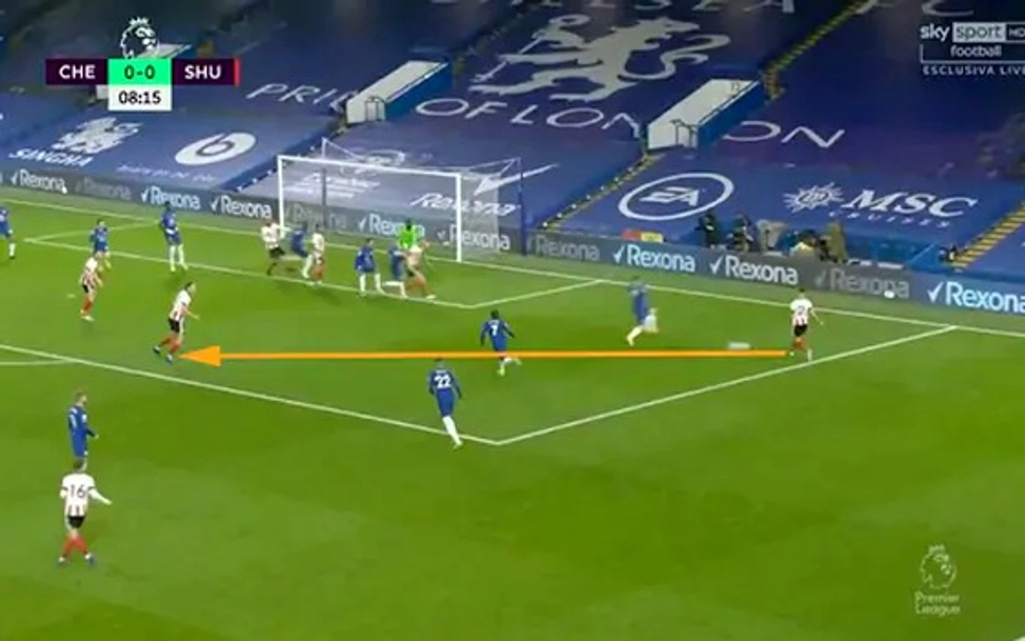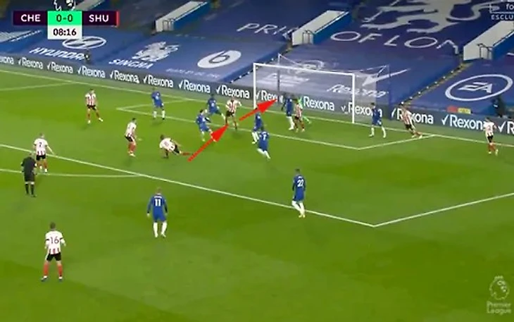 И точно так же, как в матче против «Лестера», соперник играет в «стенку». Здесь видно, как Зиеш показывает на свободное пространство за спиной Канте. В отличие от француза, Хаким заметил, что следуют рывок и передача в эту зону. Игроки же «Шеффилда» понимают, что в этой ситуации защитники будут закрывать ближнюю штангу.
