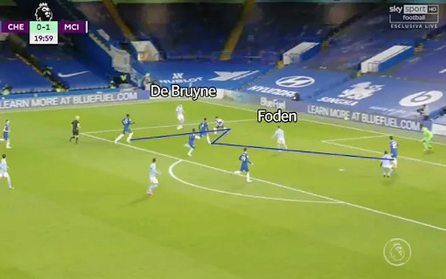 Через эту зону мяч продвигается вперёд, а Тиагу Силва старается подстраховать Зума. «Челси» возвращается в оборону, но всё ещё располагается весьма хаотично, что позволяет де Брёйне прострелить на ближнюю штангу, откуда Фоден забивает второй во встрече гол.