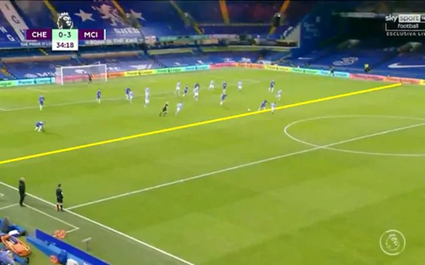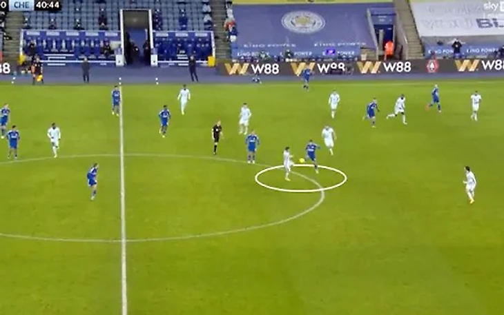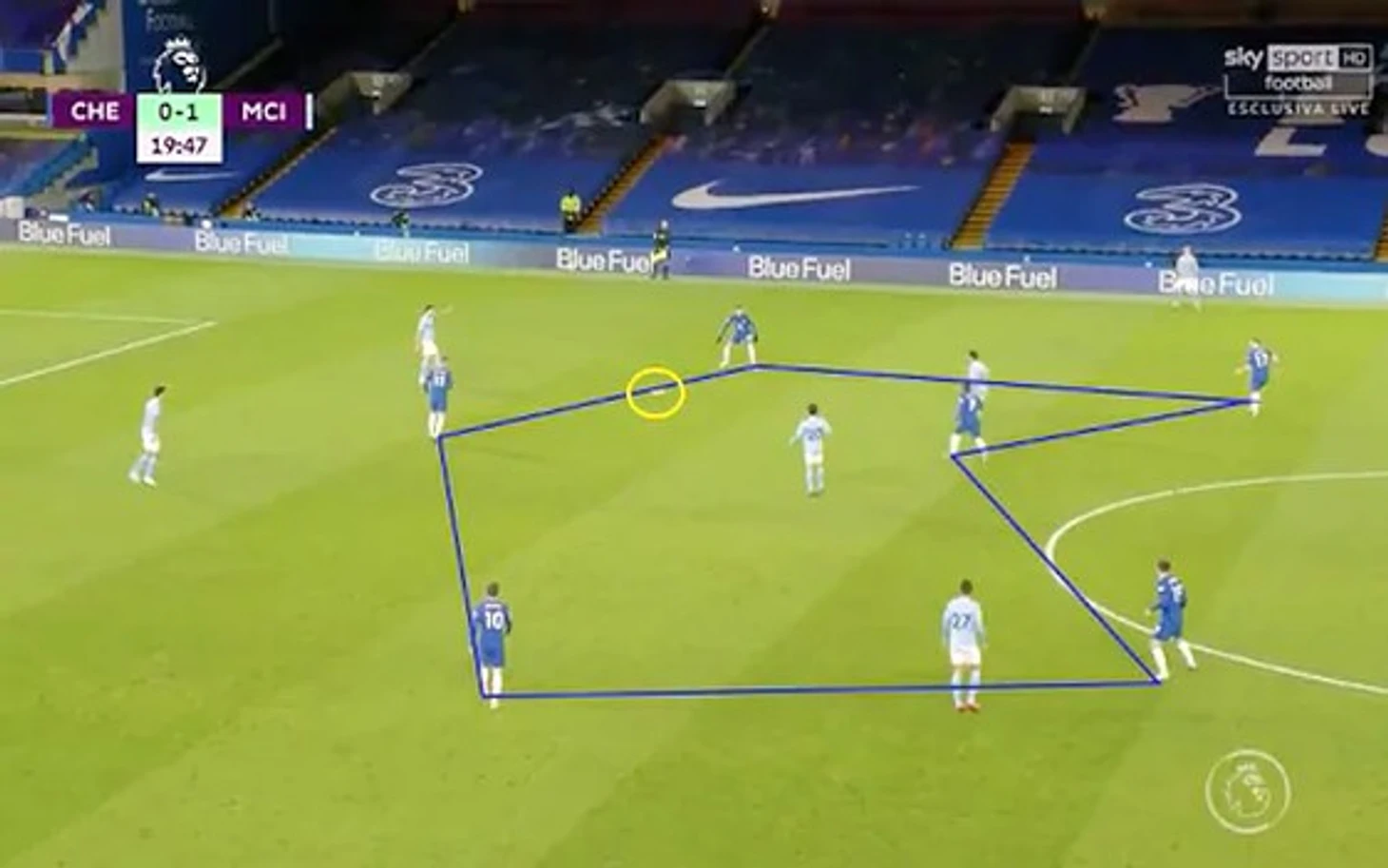 На своей половине из хавбеков «Челси» в этот момент находится только Нголо Канте, не поддерживавший атаку. Ему приходится отрабатывать за партнёров и бежать назад вместе с парой центральных защитников. Здесь ярко проявилось неумение команды перестраиваться при потере на игру без мяча.