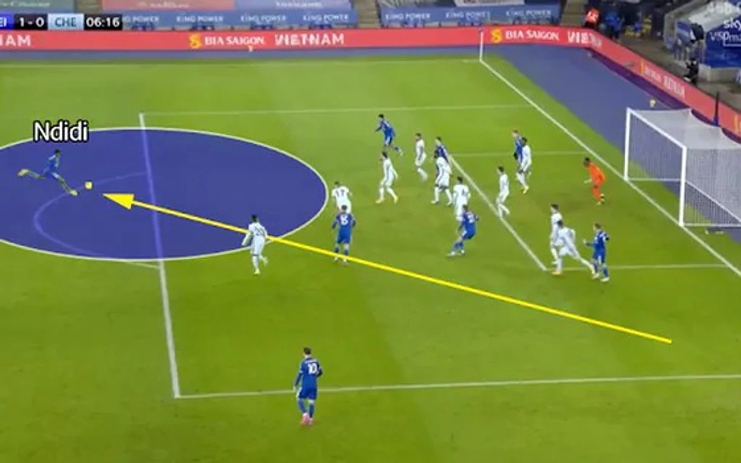 В итоге передачу принимает Ндиди. Он располагался в опорной зоне на случай предотвращения контратаки, подобной тем, что часто пропускает сам «Челси». А в этой ситуации у Вилфреда появляется возможность нанести удар, что он и делает, сильно пробив под правую от голкипера штангу.