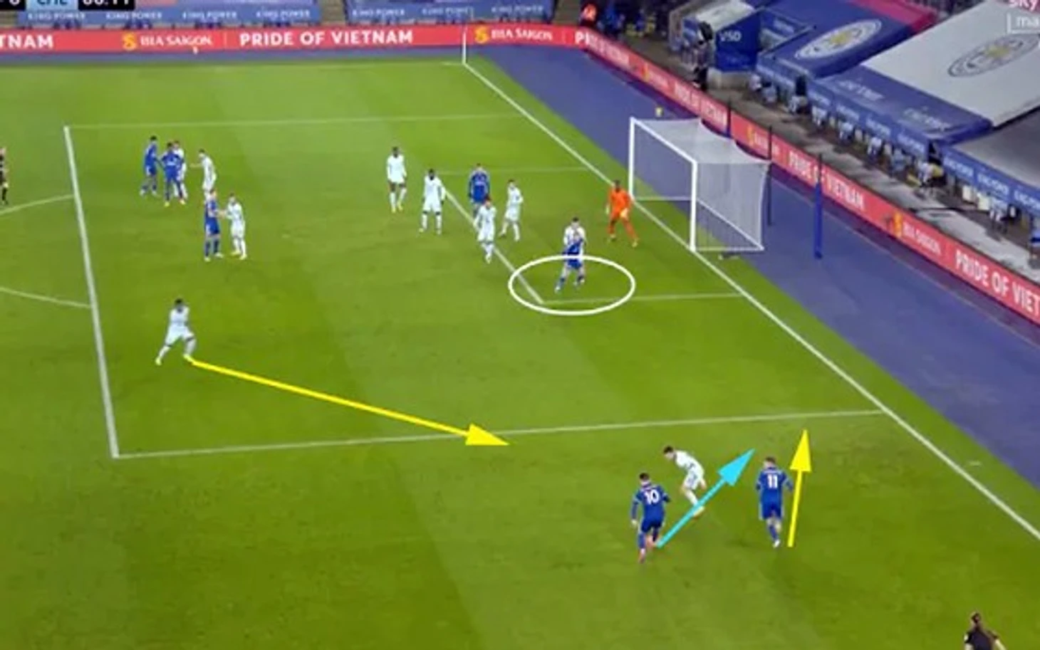 Игрок на ближней штанге должен помочь за пределами штрафной, но его отвлекает форвард соперника. И на фланге у «Лестера» образуется преимущество 2v1.