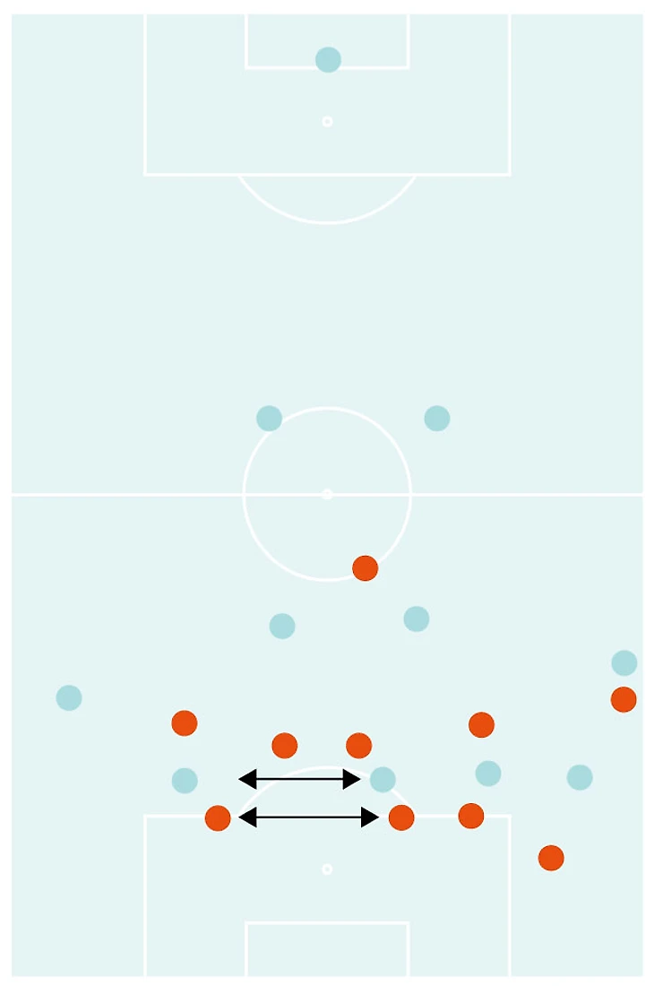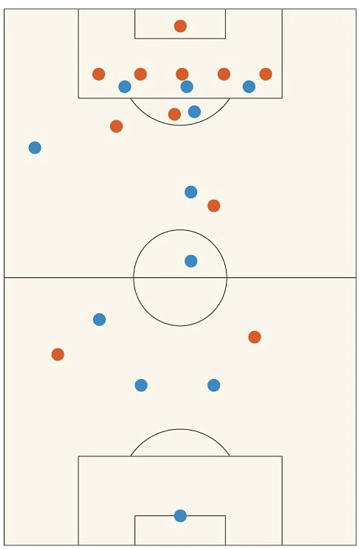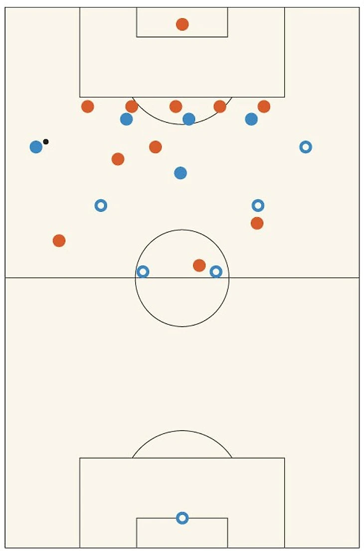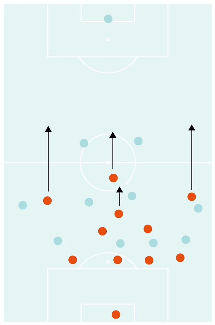 Шестеро игроков хозяев располагаются на чужой половине, но никто из них по-настоящему не создаёт сопернику трудностей при выходе из обороны. Построение смотрится угрожающе, но по факту у «Сити» вполне достаточно и свободных игроков, и пространства.