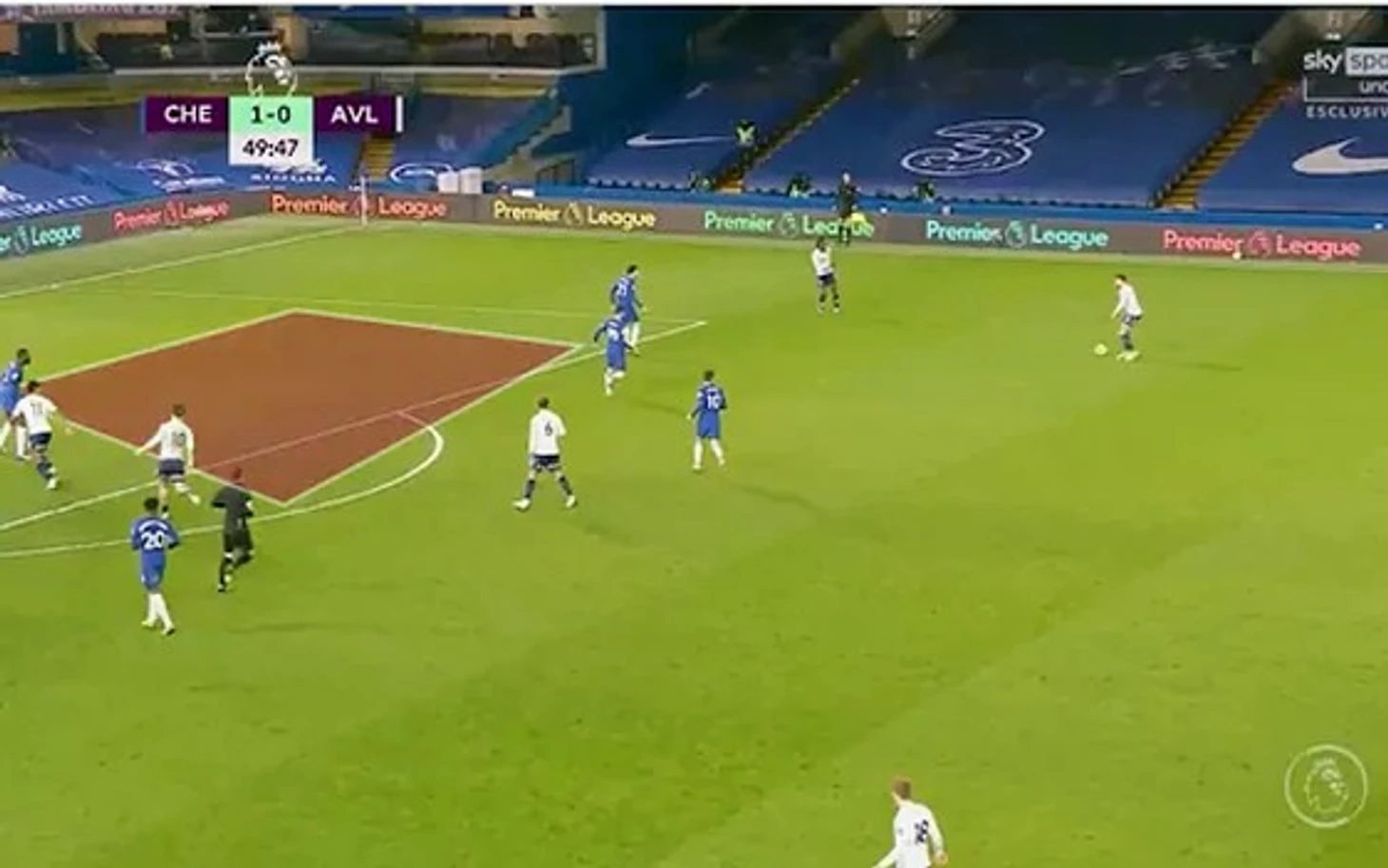 Мэтти Кэш принял передачу и готовится выполнить навес. «Челси» уже вернулся в оборону, поэтому непонятно, откуда в штрафной между Чилуэллом и Рюдигером столько свободного пространства.