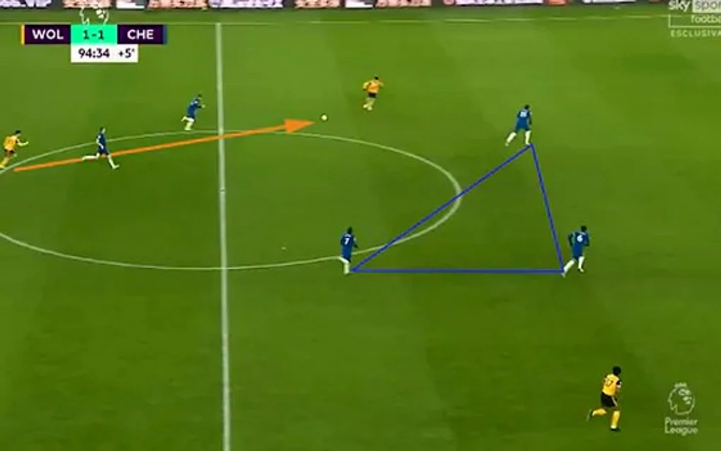 На этот раз 2v1 на фланге после короткого розыгрыша углового происходит с участием Нголо Канте.