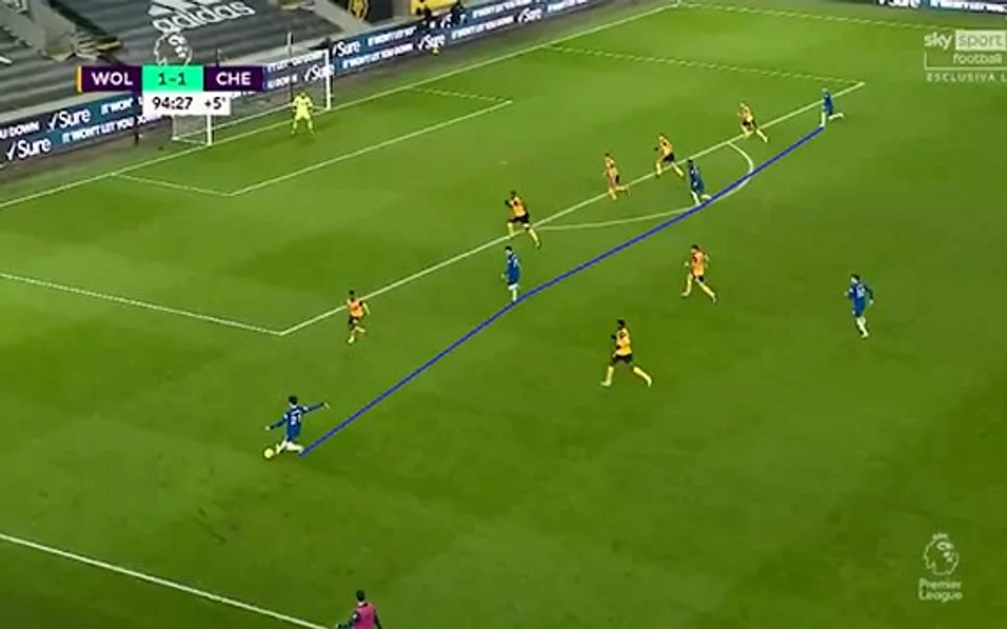 …мяч перехватывает защитник «волков» и одной передачей вперёд отрезает шестерых игроков «Челси».