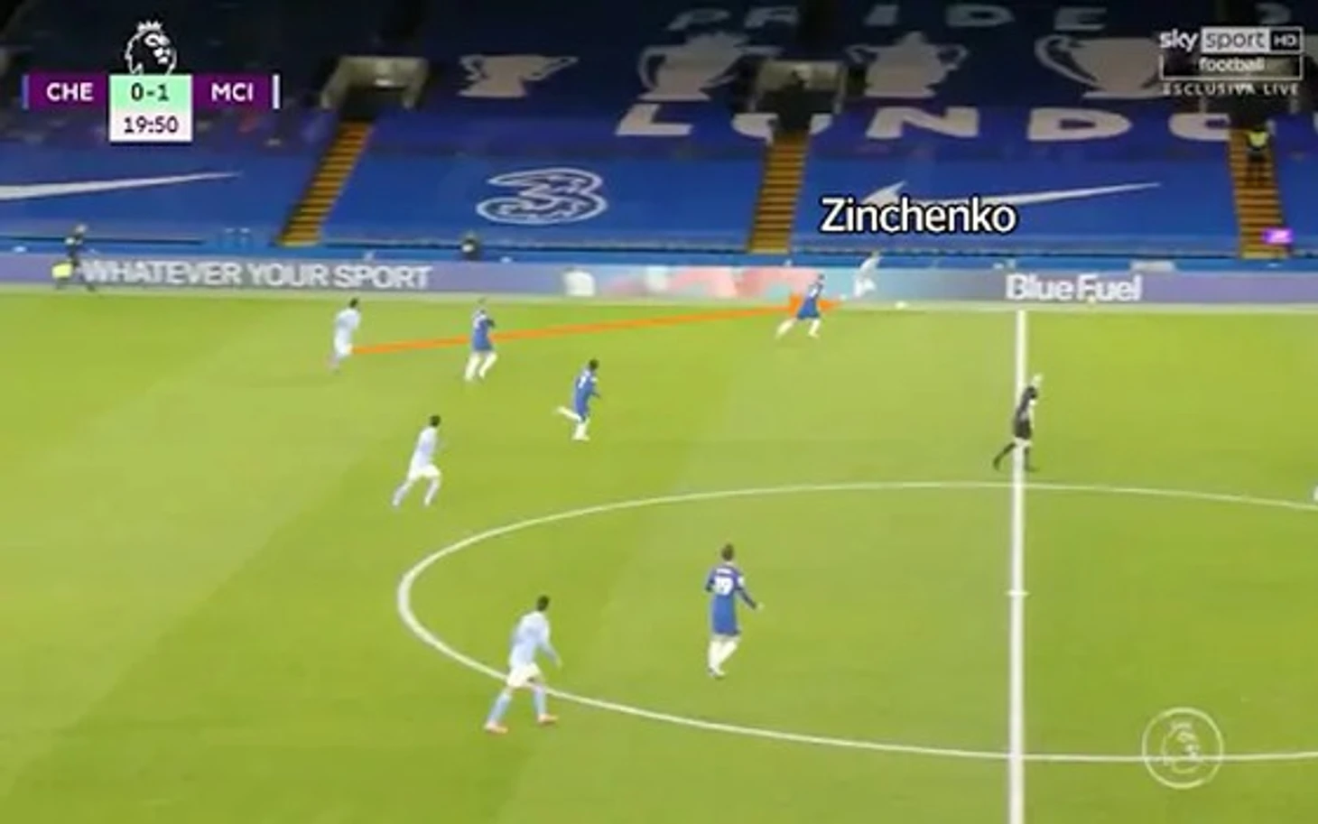 Далее следует передача к левой бровке на Зинченко. А шесть футболистов «Челси», отыгранных этим пасом, оказываются в роли догоняющих.