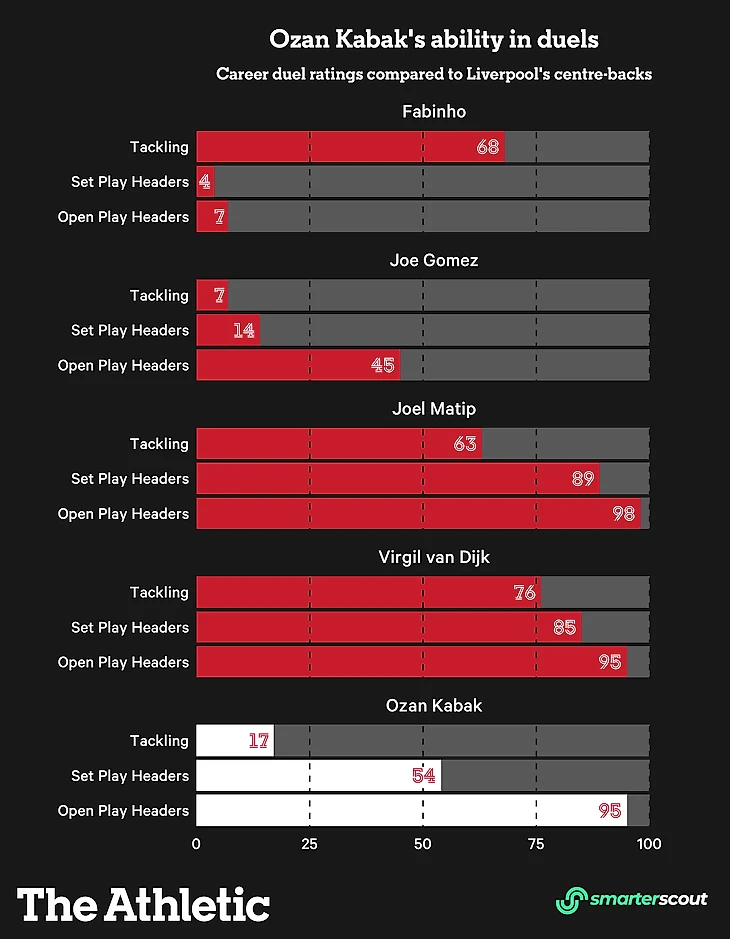 Согласно smarterscout, Кабак, похоже, довольно сильно регрессировал, когда стлался в подкатах в ситуациях один на один. В прошлом сезоне его рейтинг составлял 78/99, а сейчас упал до 17/99. Этот рейтинг отражает сложность каждой дуэли, в которую вступает защитник, наказывая их за то, что они были переиграны слабыми дрибблерами, и вознаграждая их за то, что они подкатывались под тех, у кого трудно отобрать мяч.