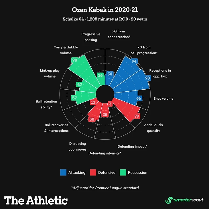 Трудное время Кабака в Германии в этом сезоне можно увидеть по его статистике smarterscout (сайт, который дает подробную аналитику игроков по всему миру, производя оценку между 0-99). Его показатели оборонительной интенсивности и воздействия значительно снизились. Это, однако, скорее всего, связано с тем, что «Шальке» как команда в целом провел ужасный сезон, пропуская почти больше всех согласно величине xG (ожидаемые голы) за 90, как сообщает Statsbomb через fbref.