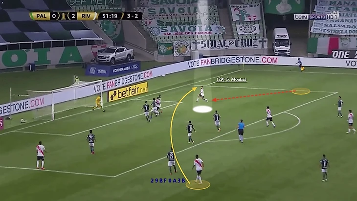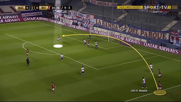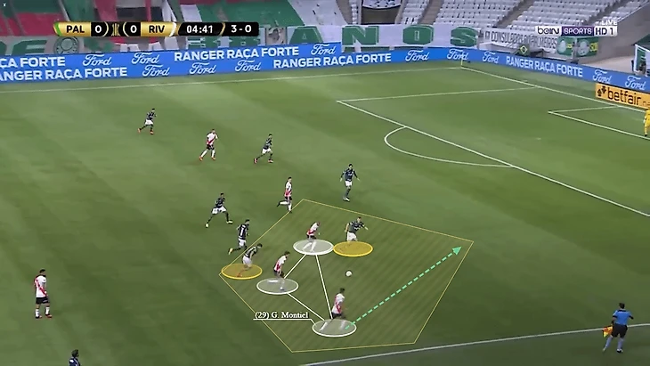Объединив это вместе с его перемещениями и тактической проницательностью, это позволяет Монтиэлю идеально располагаться, чтобы поддерживать билд-ап и широкие схемы атаки, поскольку он не только формирует треугольники и ромбы, создавая выгодные позиции для передач, но и также позволяет создать численное преимущество.