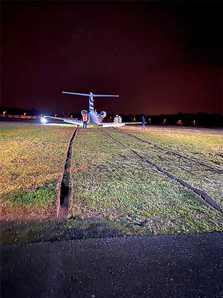 Из-за проливного дождя пилотам не удалось удержать самолет на взлетно-посадочной полосе, и он несколько десятков метров проехался по грунту, оставив глубокий след на траве поблизости. Кроме того, судя по фото, у самолета сложились шасси или, возможно, просто зарылись в грунт