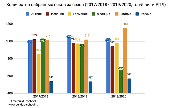 Отставание РПЛ от лучших лиг критически большое. На Францию в сезоне 2019/2020 не стоит смотреть, так как у них сезон не был доигран из-за covid-19.