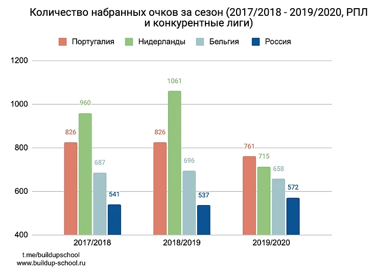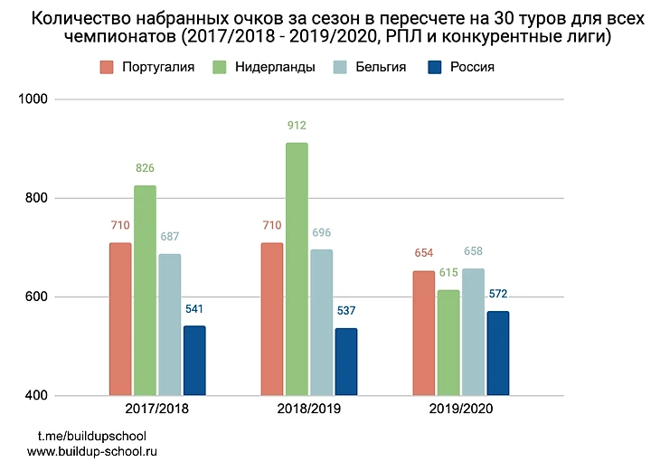 Ситуация получше, но РПЛ все еще критически далеко. В принципе топ-5 чемпионаты уже совсем далеки от нашего, поэтому лучше сравнивать с более конкурентными чемпионатами. Согласно таблице коэффициентов УЕФА сегодня выше РПЛ чемпионат Португалии, а два чемпионата ниже — Нидерланды и Бельгия. Сравним, РПЛ и чемпионаты этих трех стран.