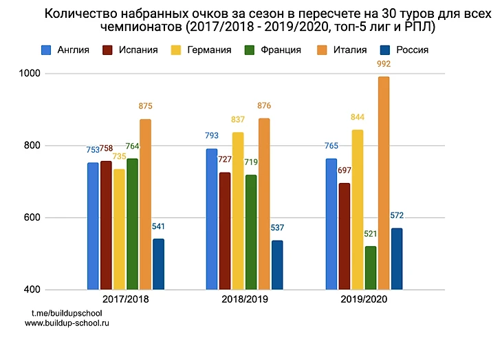 Многие могут возразить, что в других лигах играют больше туров (38 в АПЛ или 34 в Бундеслиги), поэтому больше возможностей забить голов. Это верно, поэтому мы посчитали усредненное количество голов в условиях 30 туров для всех топ-5 чемпионатов.