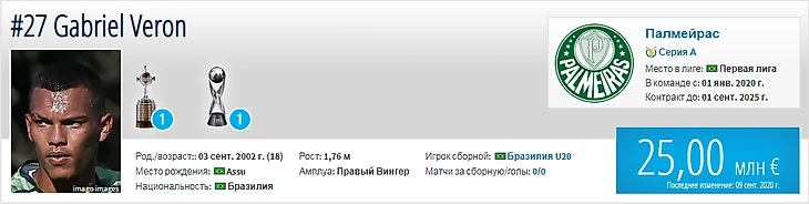 Вопросов, кто займёт первое место в нашем топе не было. Самый дорогой игрок всей лиги, которого уже сейчас сайт transfermarkt оценивает в 25.000.000, говорят нам о многом. Верону не так давно исполнилось 18 лет, а он уже провёл 36 матчей за основу Палмейраса. Игрок просто огромный талант. У игрока есть отступные в размере 60.000.000 евро, но пока, желающих заплатить за него такие деньги нет. Из качеств отметим скорость, ловкость и игру в одно касание.