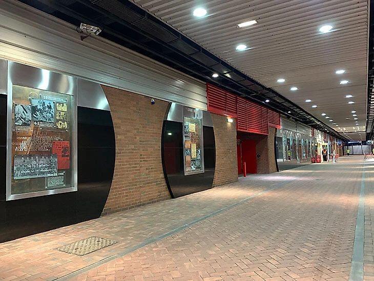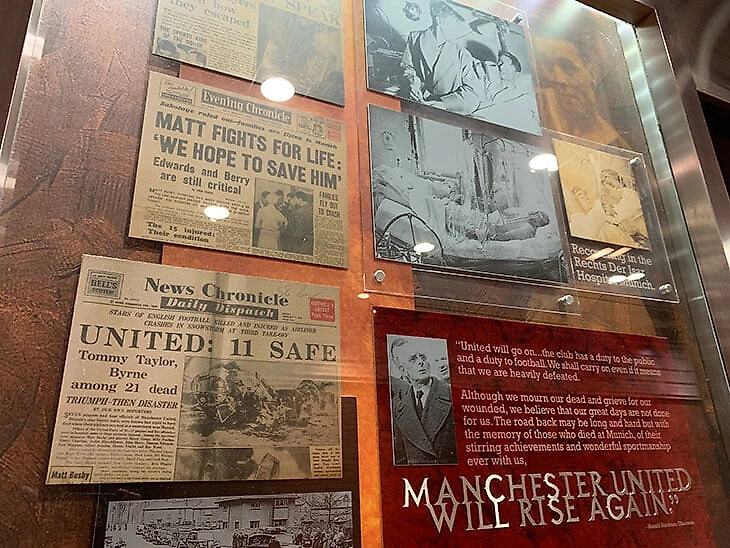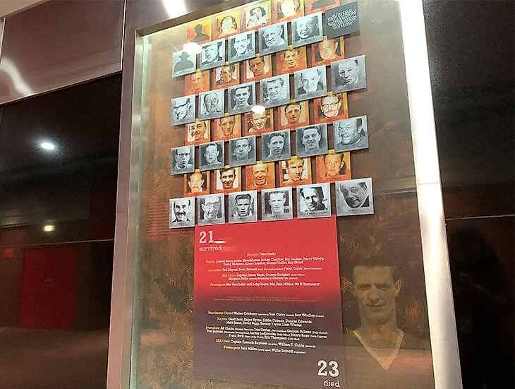 На «Олд Траффорд» катастрофе посвящен целый «Мюнхенский Тунель» – именно через него на стадион проходят журналисты, а также зрители центральной трибуны и вип-секторов. По стенам – газетные вывески, истории погибших и выживших, мемориальный огонь. На углу стадиона висят «Мюнхенские часы», остановившиеся на отметке в 3:04 – время, когда самолет протаранил забор за пределами взлетно-посадочной полосы, врезался в дом и загорелся.