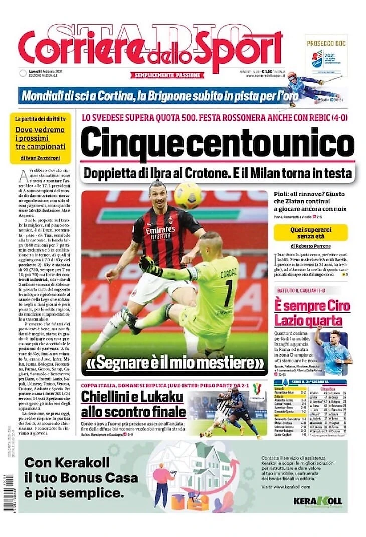 Шоу на «Сан Сиро», собственный обгон от «Милана». Дубль Златана, превзошёдшего отметку в 500 голов за клубы: «Забивать – это моя работа». Россонери возвращаются на вершину: +2 очка. В 4:0 с «Кротоне» есть также вклад Ребича.