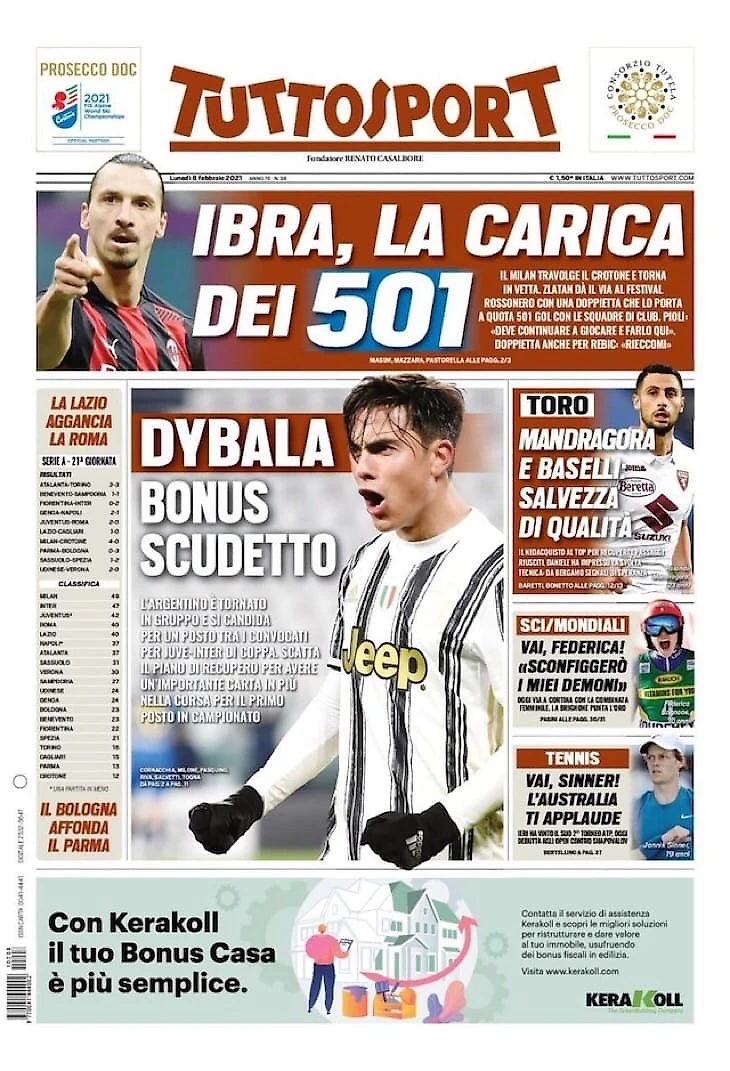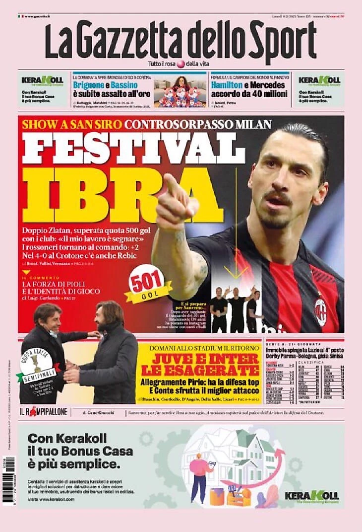 Победа «Милана» с 501 голом Ибры и возвращением на первое место, победа «Лацио» и попадание в четвёрку, а также завтрашний матч «Юве» и «Интера» в Кубке – в утреннем обзоре заголовков итальянских спортивных изданий в блоге «В гостях у Кальчо».