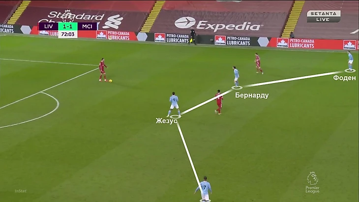 «Сити» образовывал эту формацию по-разному. Иногда Марез и Фоден оставались впереди, а Бернарду прикрывал правый фланг Мареза: