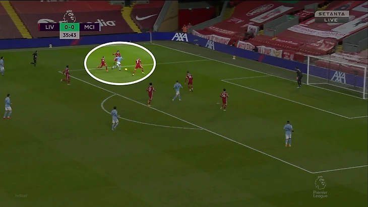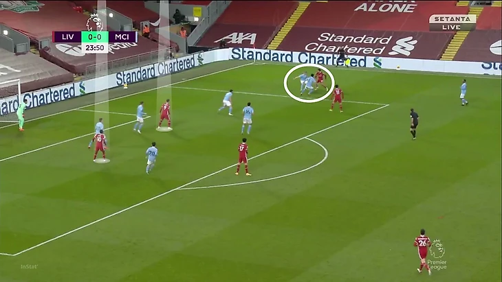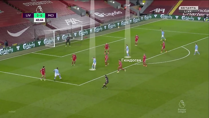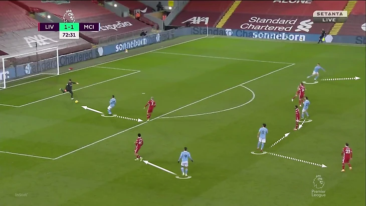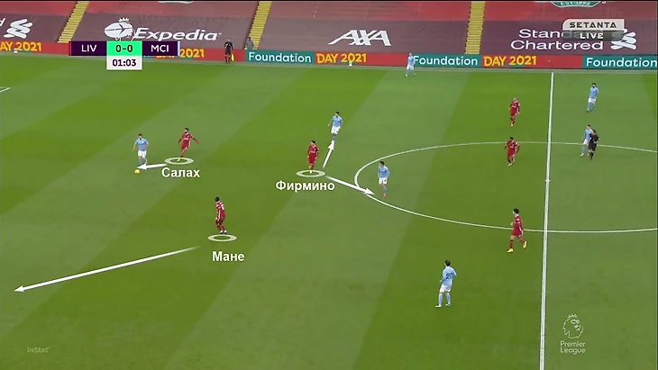 В случае «Сити» это выглядело так – Мане и Салах прессингуют центральных защитников, а Фирмино связывает сразу двух опорников (по эпизоду – Родри и Канселу):