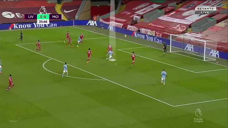 Тиаго на одной линии с Вейналдумом. Оба крайних защитника (Робертсон вне кадра) – в осторожных позициях (намного более низких, чем обычно на этой стадии атаки). Также обратите внимание на низкое расположение «Сити» (частое явление – в первой половине прессинговали намного реже обычного).