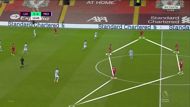 Это идеальная структура для безопасных перепасовок (я знаю, о чем вы подумали, пока мы говорим про первый тайм), но плохая для создания моментов. В стандартном сценарии Тиаго располагается выше и ищет зоны между линиями, а Трент и Робертсон создают ширину атаки. Без этих позиций «Сити» было намного легче сдерживать атаки «Ливерпуля» – не нужно реагировать на высокие позиции крайних защитников и растягиваться, следовательно, больше футболистов контролируют атакующее трио.