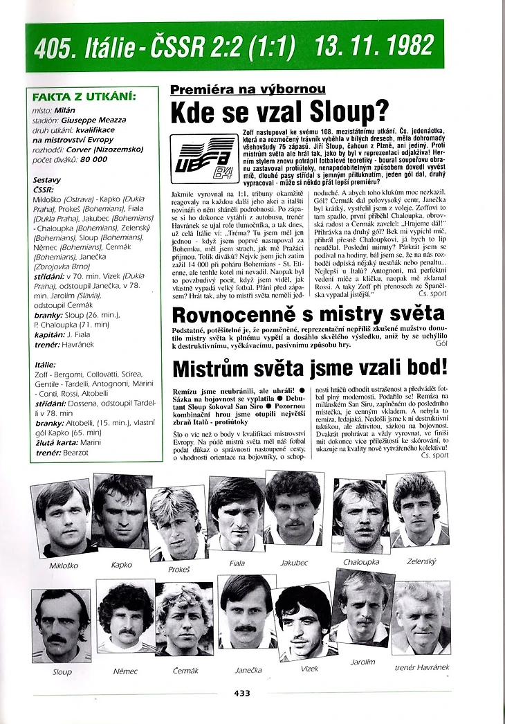 Герои новой Чехословакии, удивившие Европу в ноябре 1982. Об уровне известности этих футболистов в современной Чехии говорит заголовок вышеприведенной современной чешской заметки: "Откуда взялся Слоуп?"(Kde se vzal Sloup?)