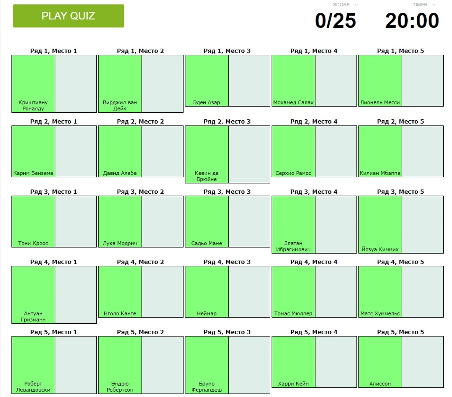 4) Отгадывать игроков можно в ЛЮБОМ порядке. Для выбора футболиста, для которого вы хотите предположить правильный ответ, нажмите на пустое серое поле справа от имени футболиста. Поэтому выбирайте сначала тех футболистов, в которых вы уверены.