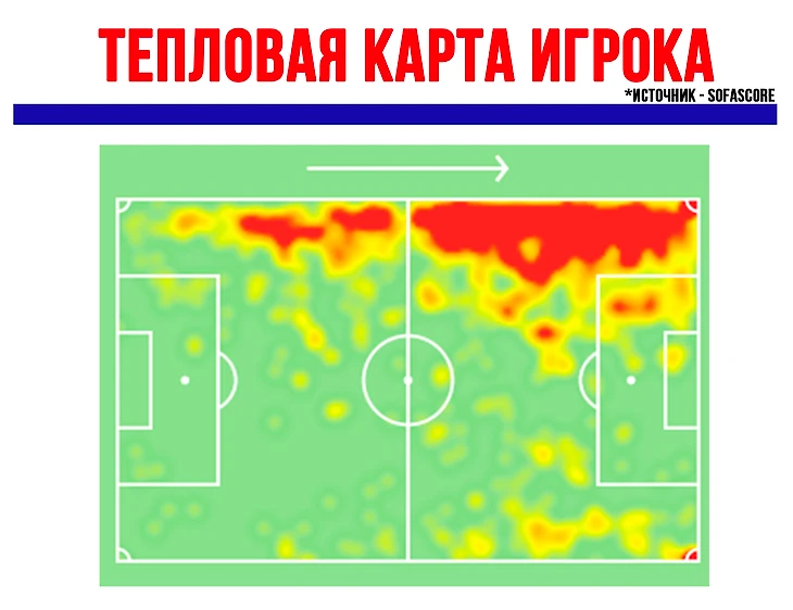 По тепловой карте Брайана видно, что он играет достаточно широко. Поэтому в большей степени Хиль заточен на создание острых моментов, нежели на их реализацию.