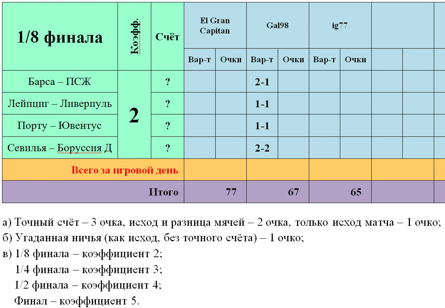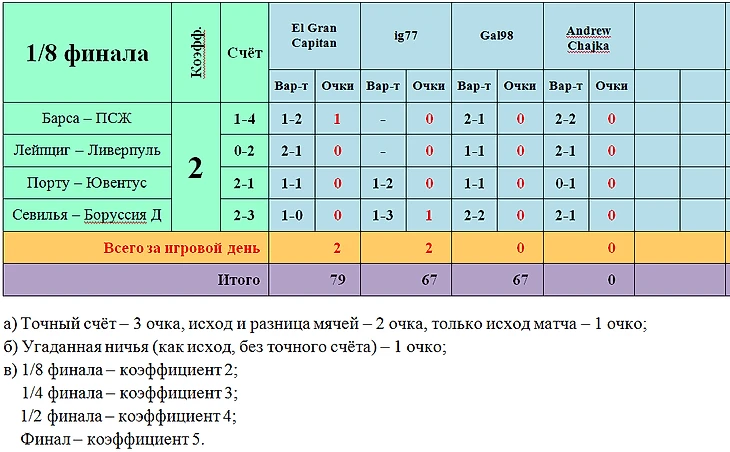 P.S. Итак, коллеги, у нас появились результаты первых матчей первых пар в 1/8 финала, а также - у нас появился новый участник нашей викторины. Поприветствуем - Andrew Chajka! Я всегда говорил, что чем больше участников - тем интереснее играть, а присоединиться можно на любой стадии, т.б., что уже начинают действовать коэффициенты плофа. Достаточно угадать результаты всех оставшихся матчей - и можно побеждать с большим отрывом :)