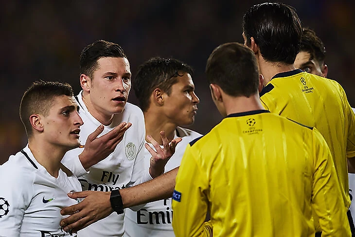 Уже в первые 10 минут мяч пару раз коснулся рук защитников в обеих штрафных. В начале второго тайма Неймар на углу штрафной споткнулся о падающего защитника Тома Менье, Айтекин поначалу пенальти не дал, но, поговорив с помощником за воротами, нашел в себе силы изменить решение. Тут же Неймар снова упал в штрафной, но это была явная симуляция, и судья не купился. К этому моменту все еще шло хорошо. Очевидные ошибки пришли потом.
