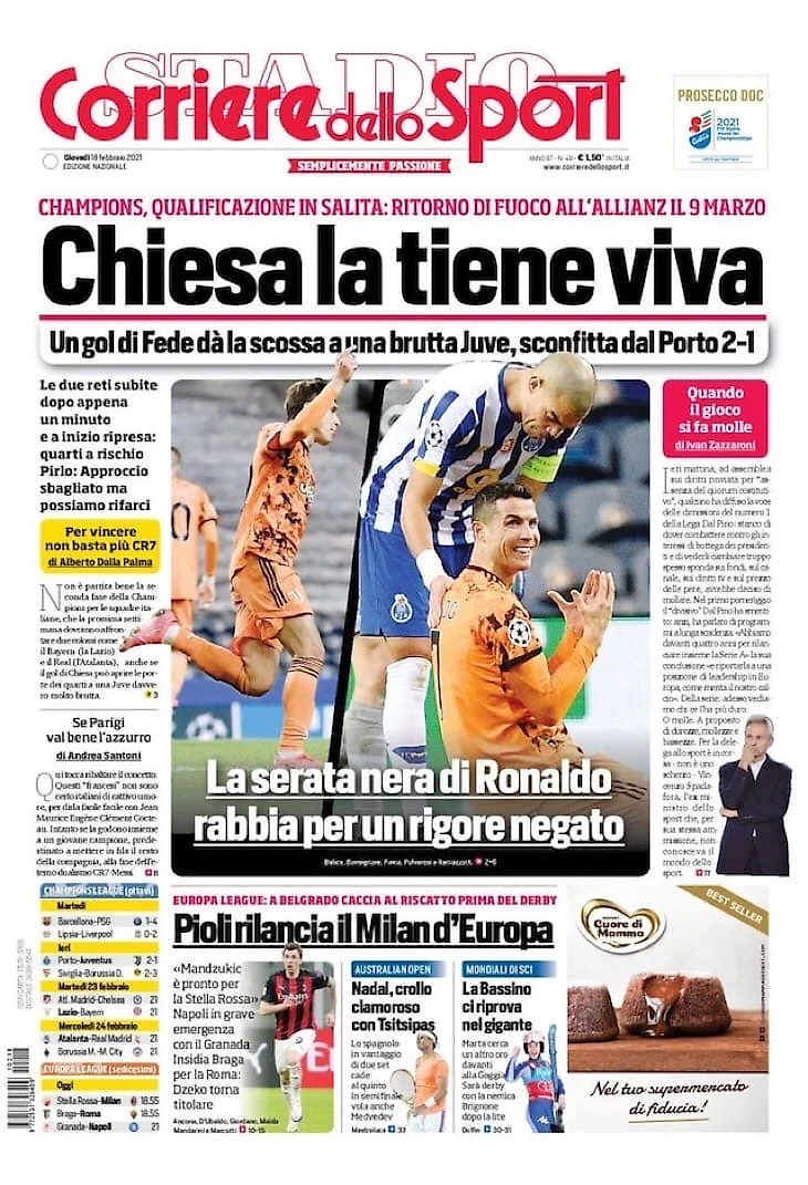 Не дали пенальти, выиграл «Порту» 2:1. Отвратительная игра Бьянконери, которые заплатили за ошибки Бентанкура и обороны. Но гол Кьезы всё ещё оставил их в борьбе. На последних секундах арбитр не дал шокирующий пенальти на Роналду. 9 марта в Турине будет очень тяжело.