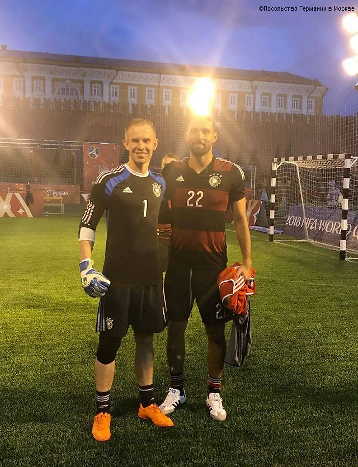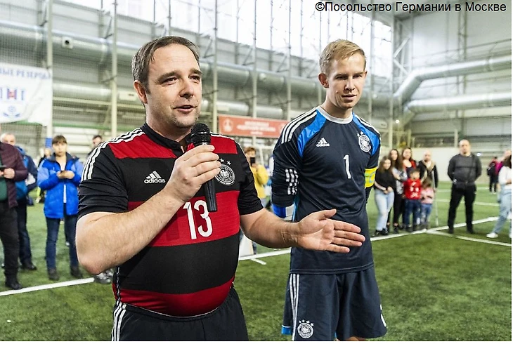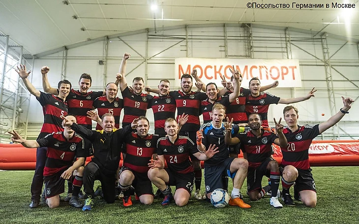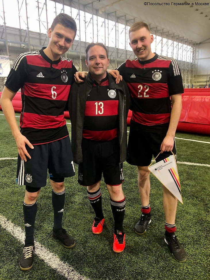 Николай: Всё верно, в Посольстве есть футбольная команда уже много лет: я работаю здесь четыре года, но команда появилась намного раньше, и я знаю как минимум двоих капитанов, которые были до меня, ведь дипломаты, как правило, каждые четыре года переезжают на новый пост, в другую страну. Наша команда состоит как из немцев, которые живут и работают в Москве, так и из российских поклонников немецкого футбола.