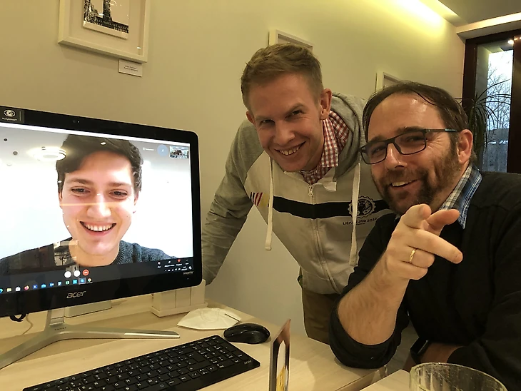 Где во время пандемии можно встретиться с немецкими футболистами и как, несмотря на локдаун, посетить Германию? Мне это удалось, ведь кафе «Moskau-Berlin», где состоялось интервью, находится в Посольстве Германии, то есть — на немецкой территории. И в представительстве этой страны есть люди, преданные футболу и посвящающие ему всё своё свободное время. Мои собеседники — работники Посольства Германии в Москве: сотрудник отдела культуры Николай Зизевский, врач Майк Хельмбрехт и практикант Вилли Штигер, который уже уехал из Москвы и потому принял участие в разговоре по видеосвязи. Все трое — игроки футбольной команды Посольства, Николай — её капитан.