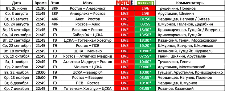 Как видим, в эфире общедоступного канала были показаны все матчи наших команд в Лиге чемпионов. Отдельно стоит сказать о платных каналах: «Футбол 1» впрямую показал лишь игры «Ростова» с «Андерлехтом» в квалификации, в остальных случаях были накладки, а в отличие от НТВ «Матч» оставлял общедоступному каналу эксклюзив на матчи российских команд. Интересно, что в первом туре обе наши команды играли в Германии, поэтому на оба матча был отправлен дуэт Сергей Кривохарченко – Роман Гутцайт.