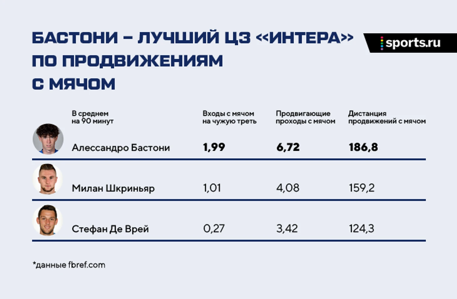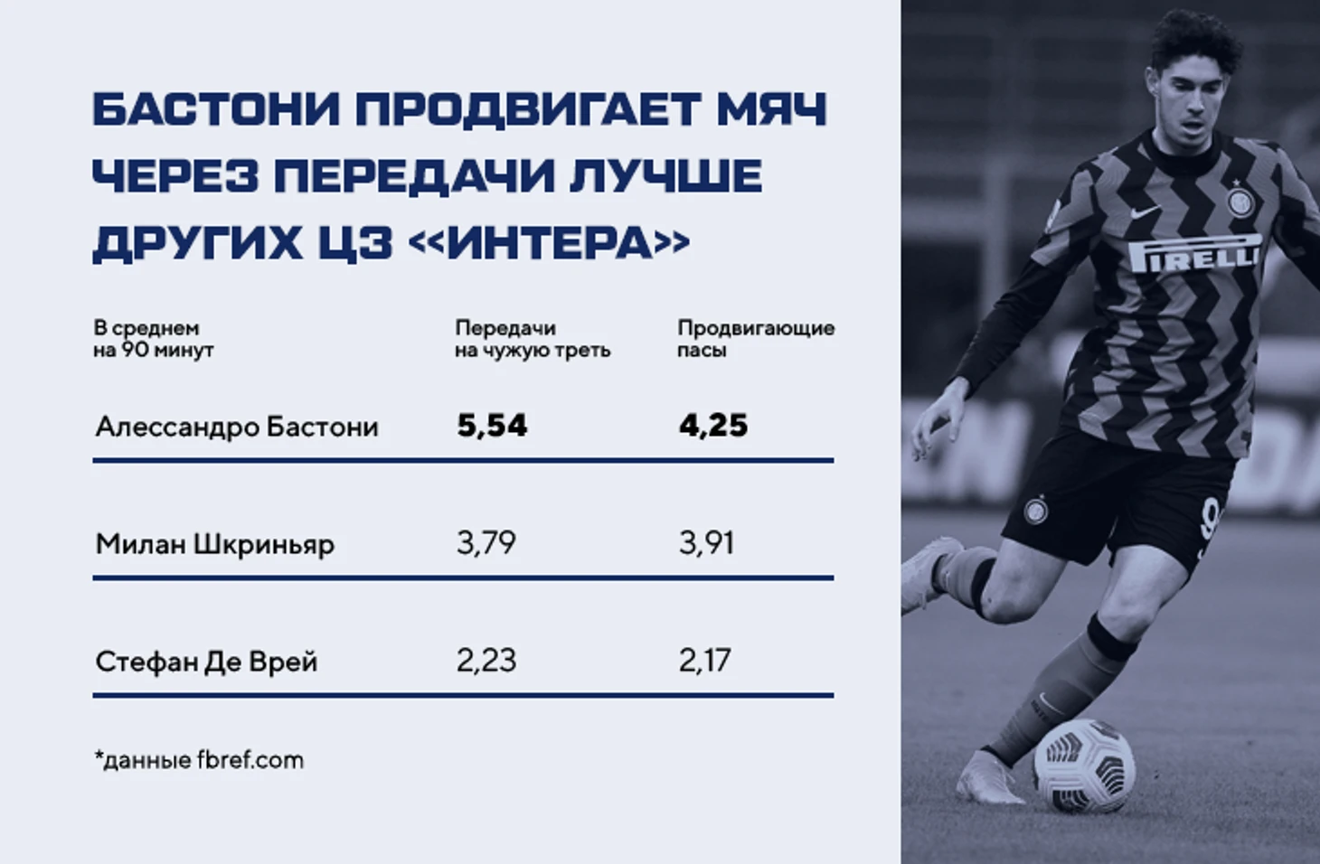 Последнее определение трудное, но если вчитаться, логичное (для измерения влияния игрока на продвижение) и понятное: команда делает серию передач без продвижения, а потом чей-то пас значительно улучшает положение команды в атаке – продвигает мяч на 10 и более метров. Это полезное продвижение и считается продвигающим пасом. Бастони выделяется и в более простой метрике доставки мяча на чужую треть, и в самих продвигающих передачах: