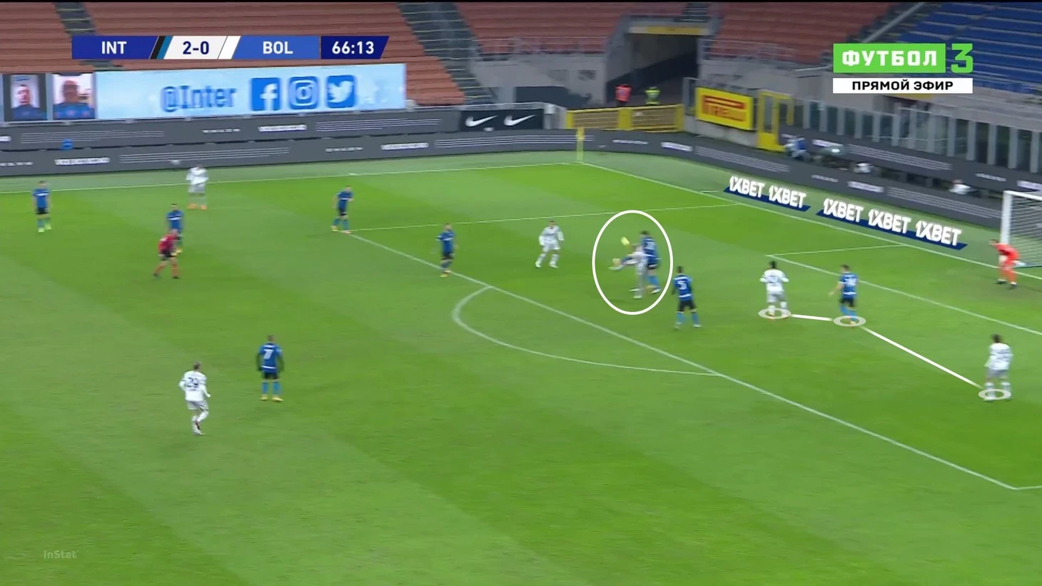 Прогресс заметен, но иногда проблема напоминает о себе. Конте требует от Бастони выдвижений. Тот выдвигается, но не всегда выбирает оптимальный для этого момент. Эпизоды, когда плохо оценивает ситуацию, могут дорого стоить. Например, в этой ситуации Бастони выдвинулся с опозданием и без оценки эпизода (за ним был оппонент – открывающийся в штрафную Дзадза):