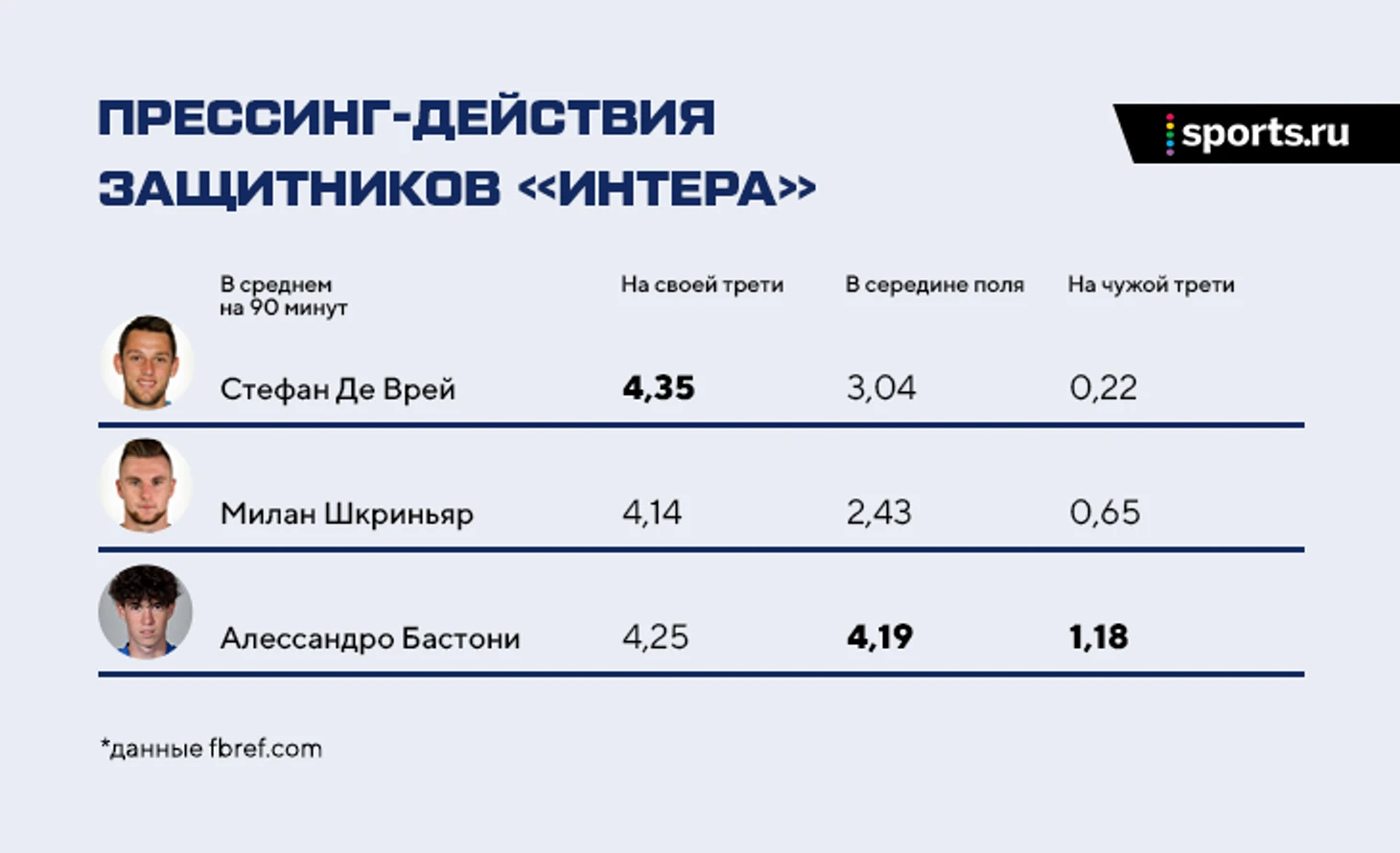 Манеру игры (именно манеру, а не уровень) Бастони можно проследить через прессинг-действия в сравнении с партнерами по линии. Он – самый агрессивный из защитников «Интера».
