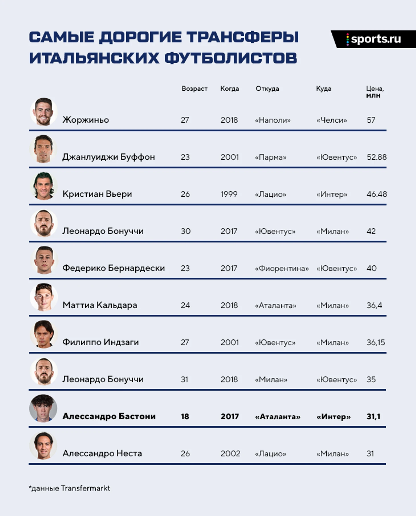 Бастони стал дорогим молодым игроком в истории итальянского футбола, переход в «Интер» катапультировал его в десятку самых дорогих футболистов страны в очень символическую компанию – между Леонардо Бонуччи и Алессандро Нестой.