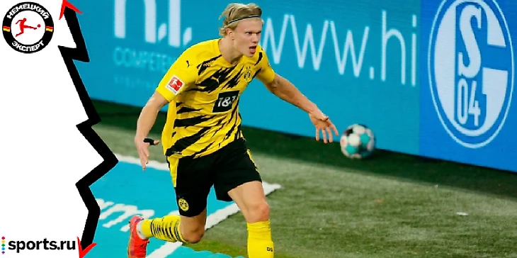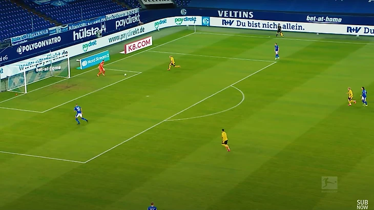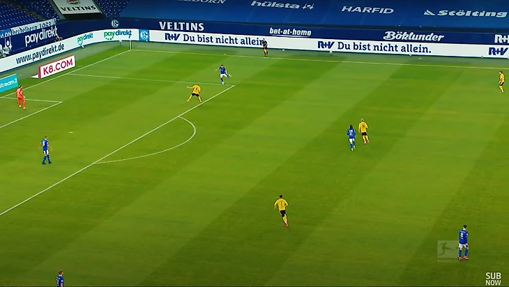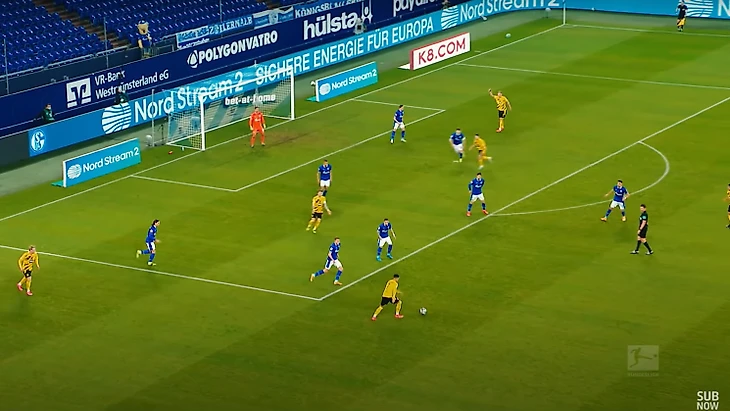 Прекрасно видно поднятую руку нападающего который просит навесную передачу, Холанд очень здорова открывается, это можно заметить в любом матче. Санчо сделает точную навесную подачу и Холанд забьет фантастический мяч ворота «Шальке».