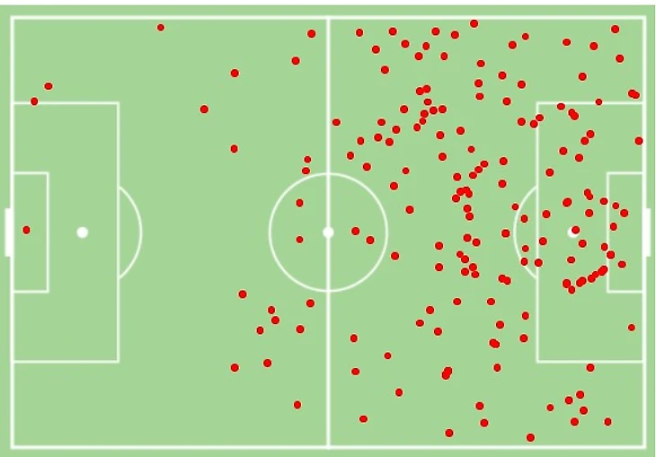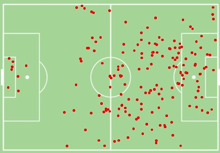 На КА видно что футболисты практически одинаковы активны, на одинаковых зонах. Холанд больше отрабатывает в обороне, и возвращается назад. Роберт больше работает на полу фланге. В целом можно сказать что карты ничем в принципе не отличаются.