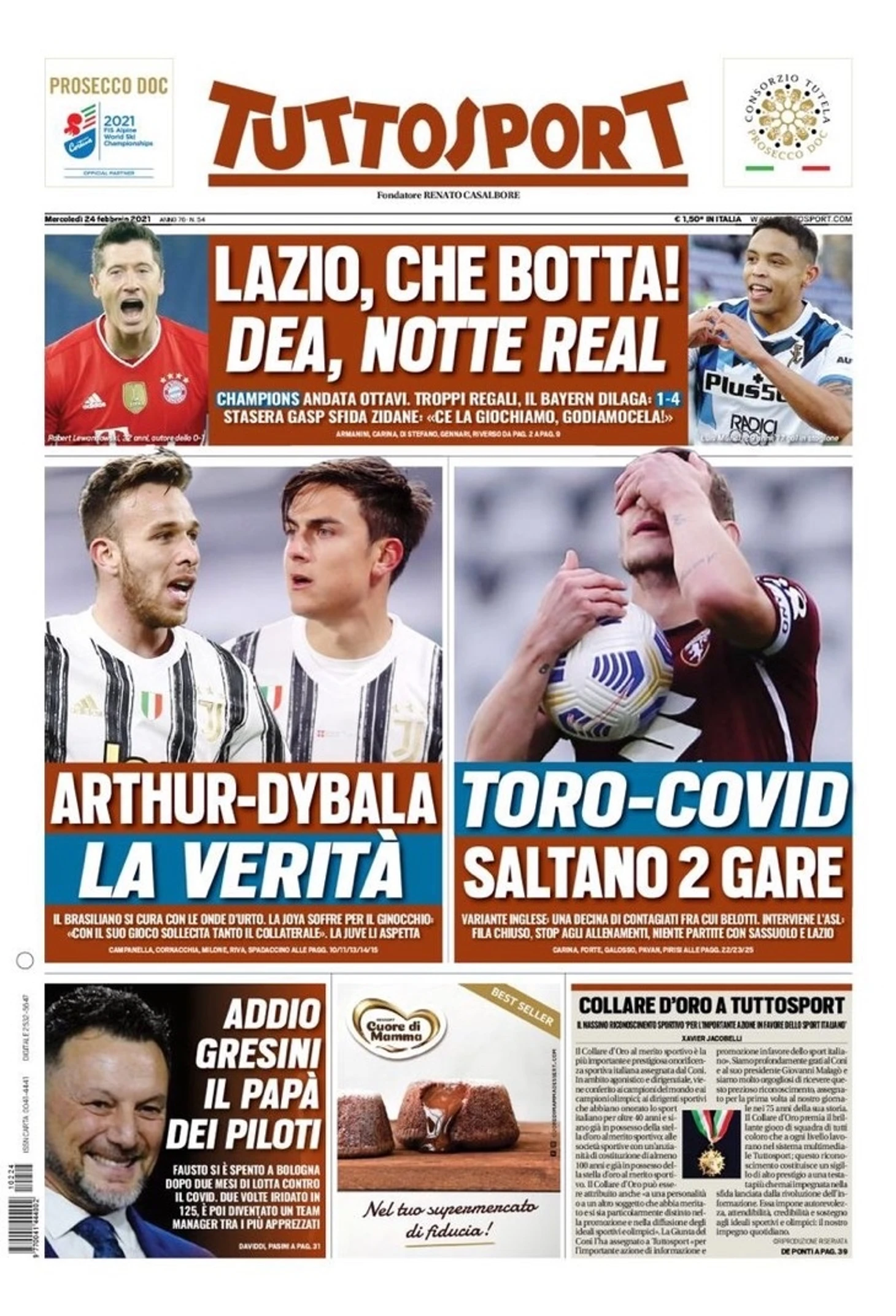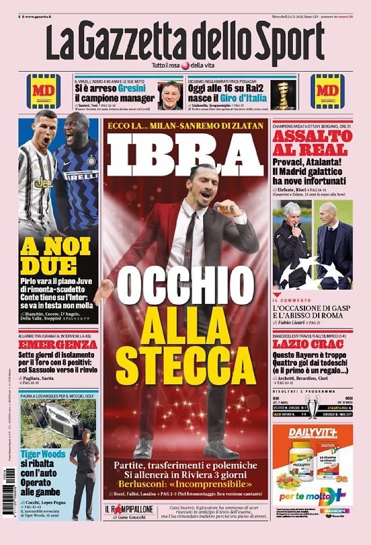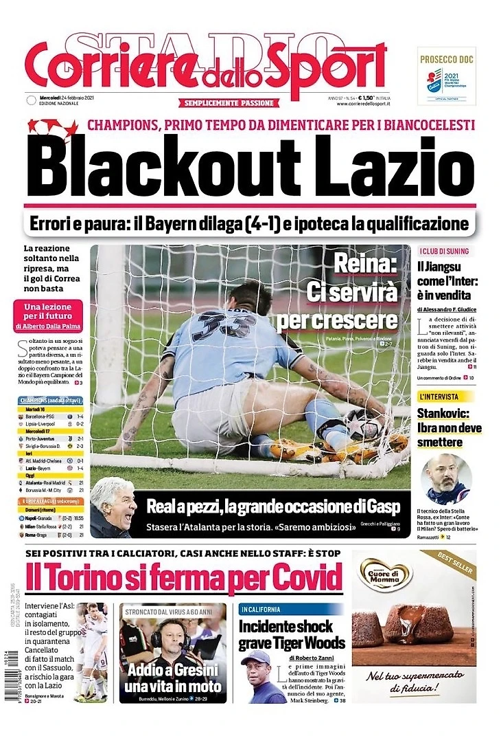 Поражение «Лацио» от «Баварии», сегодняшний матч «Аталанты» с «Реалом», вспышка Ковида в «Торино», а также споры вокруг участия Златана на фестивале Санремо – в утреннем обзоре заголовков итальянских спортивных изданий в блоге «В гостях у Кальчо».