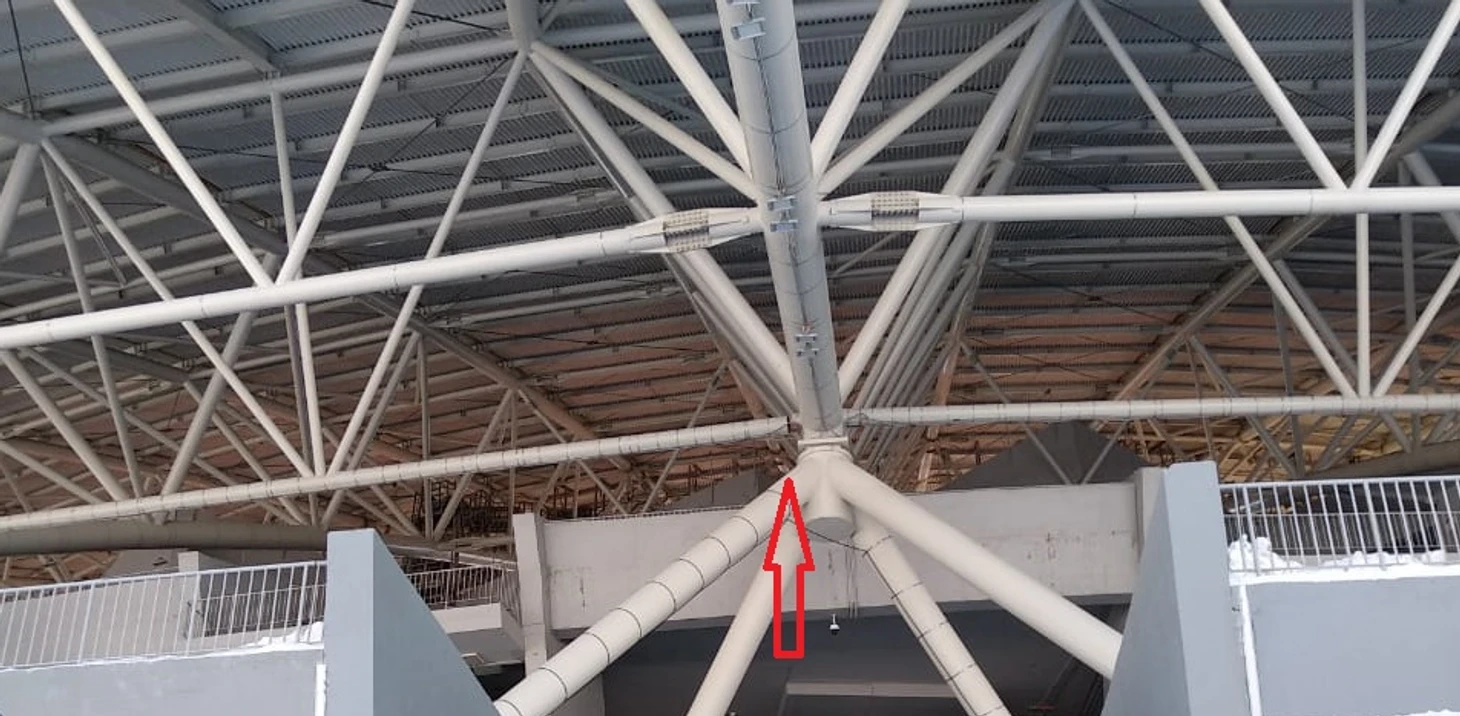 1. Если увеличить снимок, то на нём отчётливо видно дефект металлоконструкции. Представители организации, которая эксплуатирует стадион, утверждают, что это горизонтальные балки.