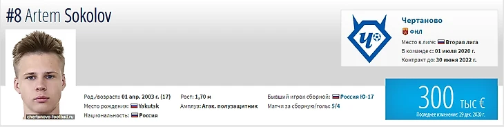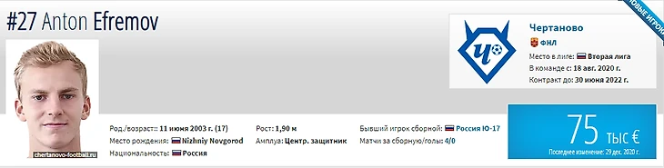 На пятое место поставим молодого центрального защитника из клуба Чертаново. В Чертаново он пришёл только в августе 2020 года, и пока провёл за клуб всего 2 матча, но думаю со временем он будет получать больше игровых минут. У него отличный рост 1,90 для позиции центрального защитника и отличные дальние передачи. Вызывался в сборные России U-15, U-16 и U-17.