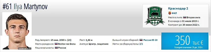 Создать топ и не включить в него футболиста из Краснодара, это очень сложная задача. Да, парню в январе исполнился 21 год и он самый старший в нашем топе, но я считаю, что этот парень обладает определённым талантом, и надеемся он сможет его раскрыть. В этом сезоне ФНЛ он провёл 18 матчей, а всего у него есть уже 49 матчей в этом турнире. На мой скромный взгляд этот парень очень недооценён. В 2017 году английское издание The Guardian включило Мартынова список 60 лучших молодых игроков мира, которые родились в 2000 году. Из качеств отметим позиционную игру, хороший пас и умение не выбрасываться на соперника, а вступать в борьбу, только когда этого требует ситуация на поле.