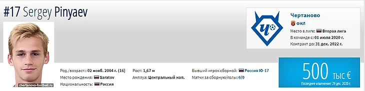 Сомнений в том, кто займёт первое место в нашем топе просто не могло быть. Футболистов с таким уровнем таланта и потенциала на данный момент в ФНЛ просто и близко нет. Да, про парня возможно слишком много пишут и говорят, но с другой стороны, как можно этого не делать, когда вдруг появился такой футболист? Пиняем дебютировал в ФНЛ в возрасте 15 лет и 8 месяцев. Сейчас у него уже есть 14 матчей в этом сезоне, но если бы не травма, то этих матчей было бы явно больше. Сайт transfermarkt уже оценивает его в 500.000 евро, и считает его самым дорогим в своём клубе. Много где пишут и говорят, про очень большую заинтересованность в игроке со стороны Манчестер Юнайтед.